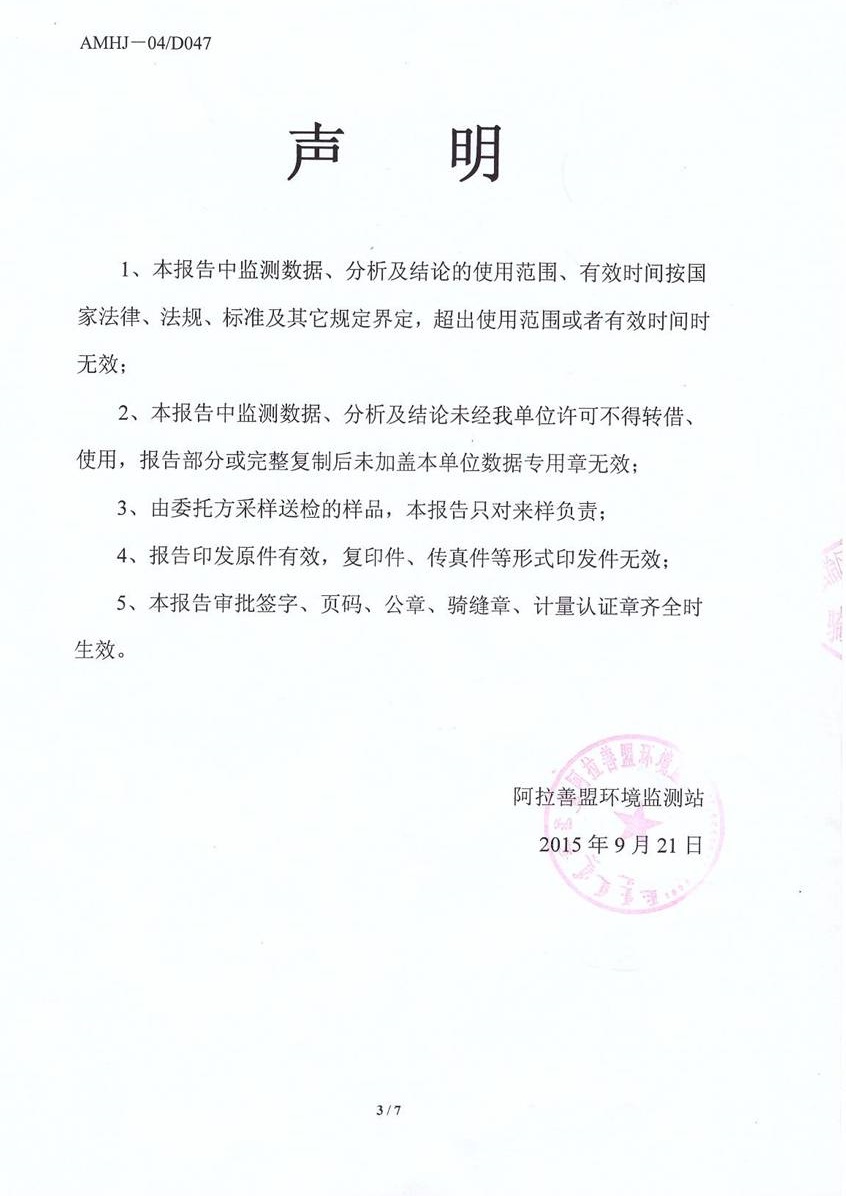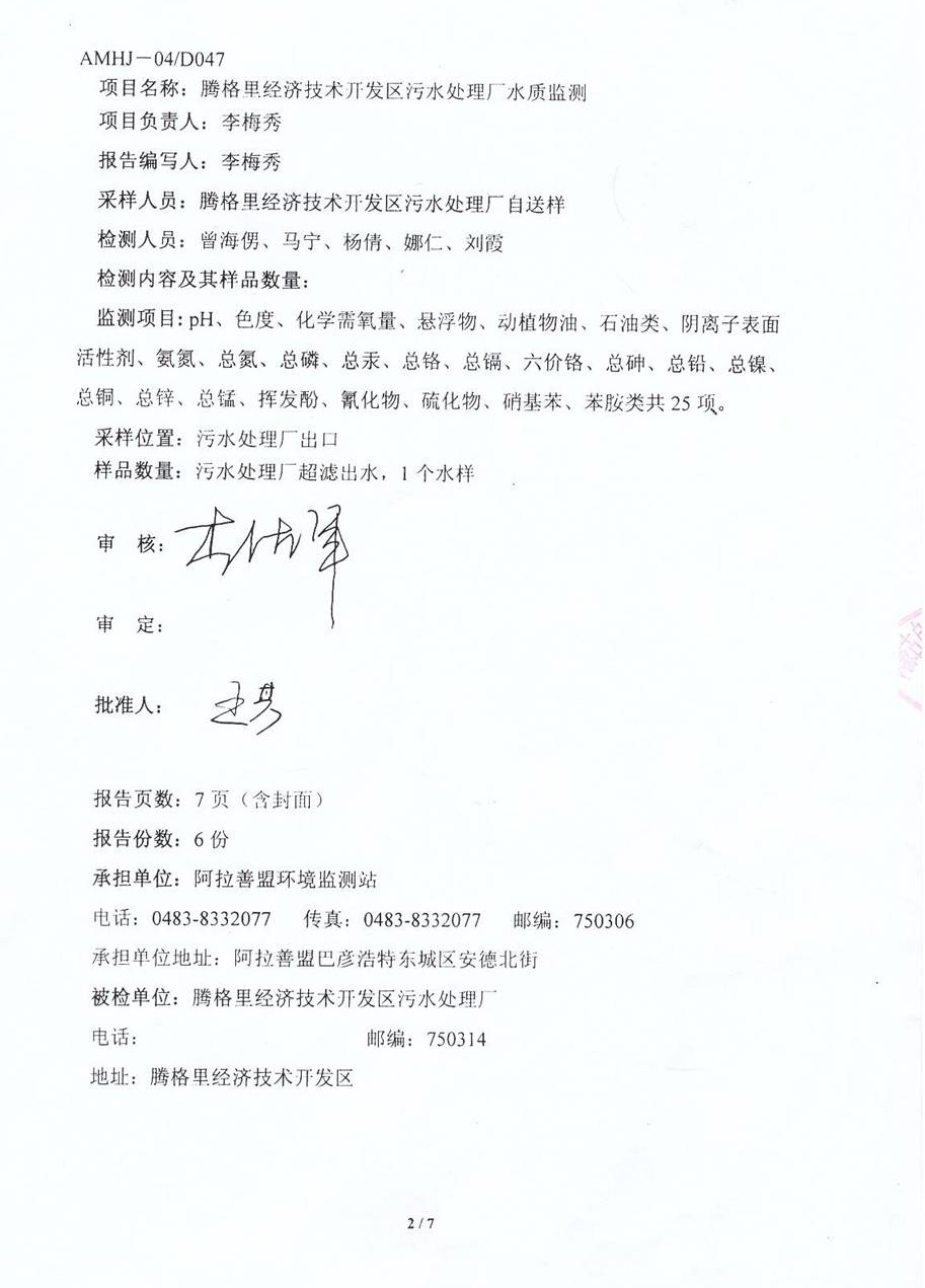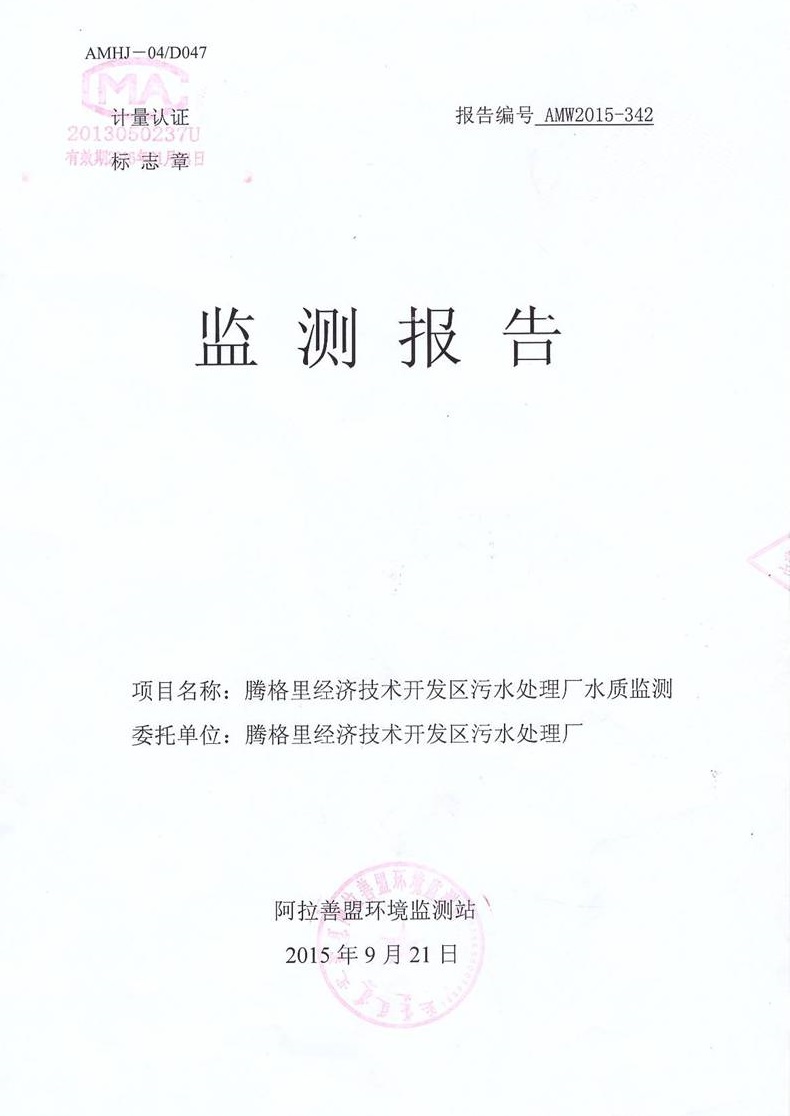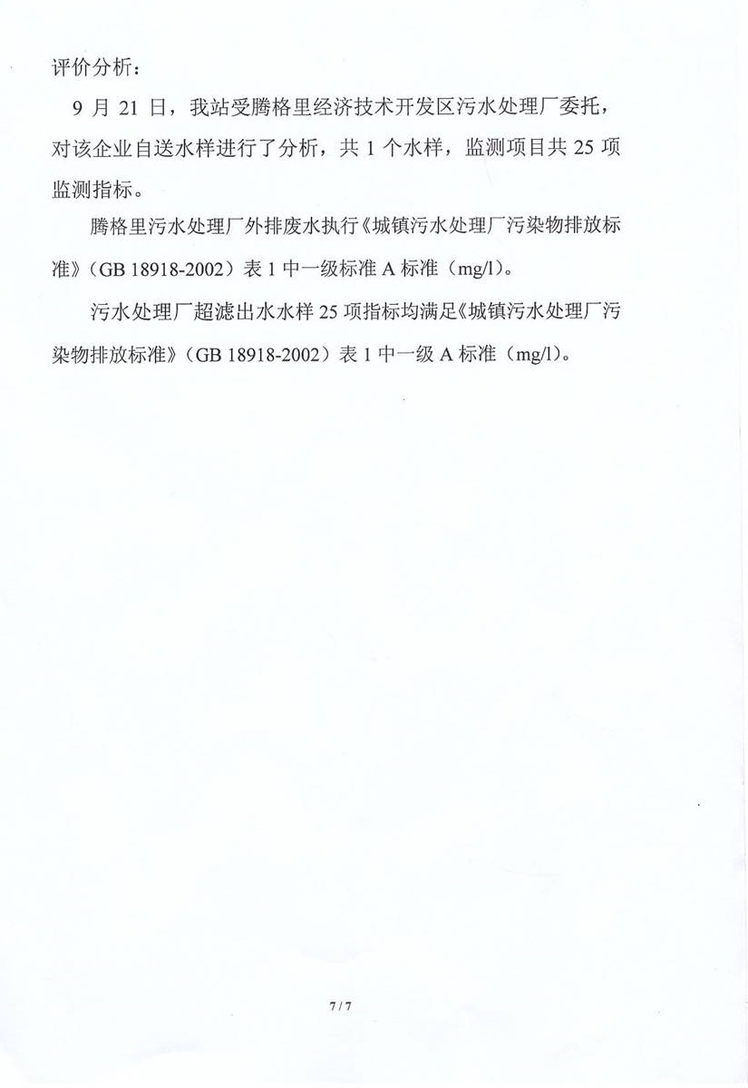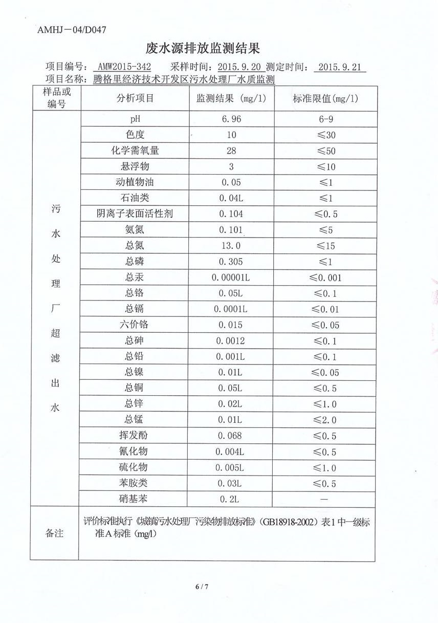 2015年9月21日,受騰格里經(jīng)濟(jì)技術(shù)開(kāi)發(fā)區(qū)污水處理廠委托,阿拉善盟環(huán)境監(jiān)測(cè)站對(duì)園區(qū)內(nèi)水廠出水水樣進(jìn)行分析,出具水質(zhì)監(jiān)測(cè)報(bào)告,報(bào)告顯示,騰格里污水處理廠外排廢水執(zhí)行《城鎮(zhèn)污水處理廠污染物排放標(biāo)準(zhǔn)》(GB18918-2002)表1中一級(jí)標(biāo)準(zhǔn)A標(biāo)準(zhǔn)(mg/l)。污水處理廠超濾出水水樣25項(xiàng)指標(biāo)均滿足《城鎮(zhèn)污水處理廠污染物排放標(biāo)準(zhǔn)》(GB18918-2002)表1中一級(jí)標(biāo)準(zhǔn)A標(biāo)準(zhǔn)(mg/l)。